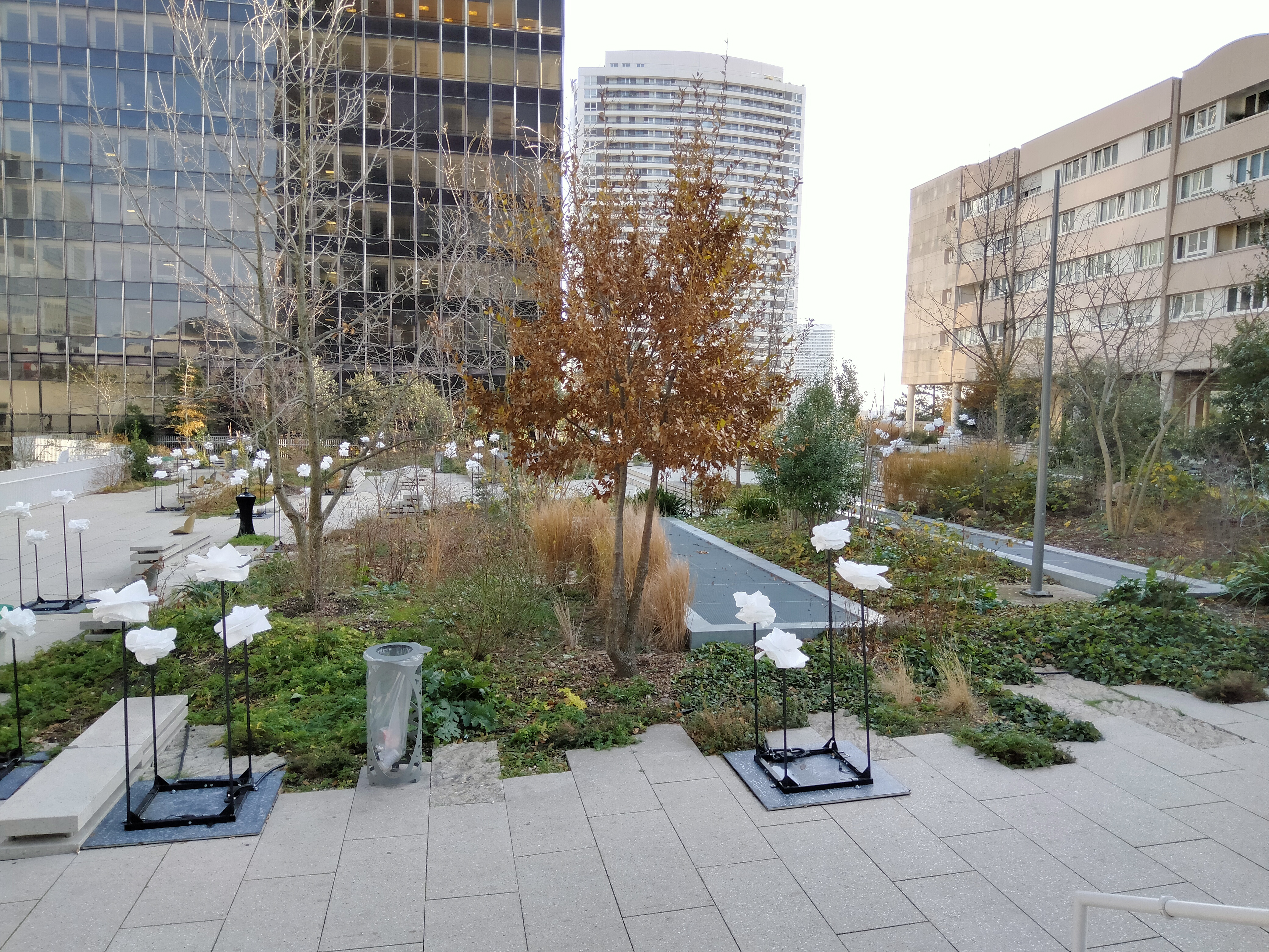 Espace intéressant qui met un peu de verdure sur la dalle de la Défense.